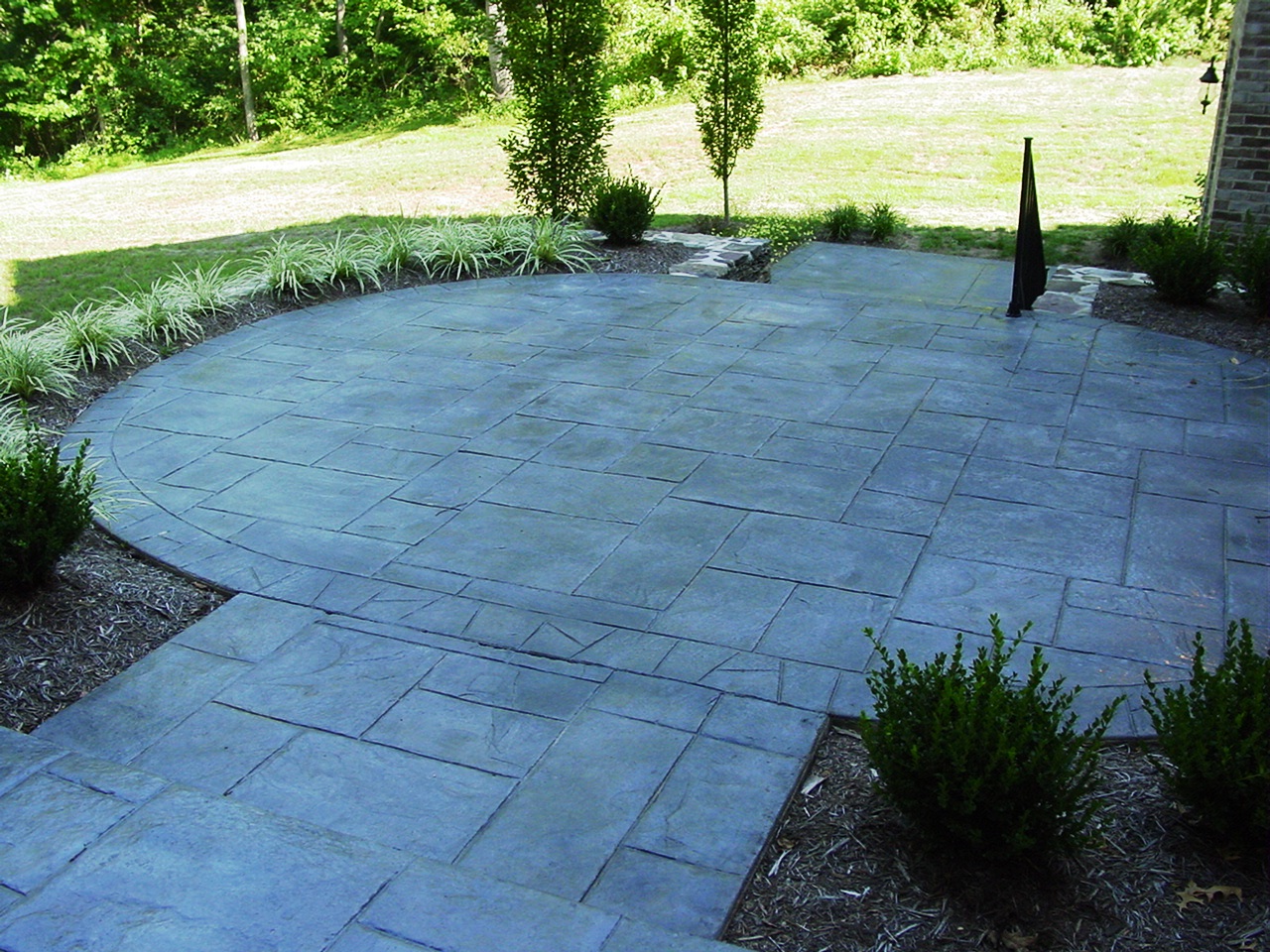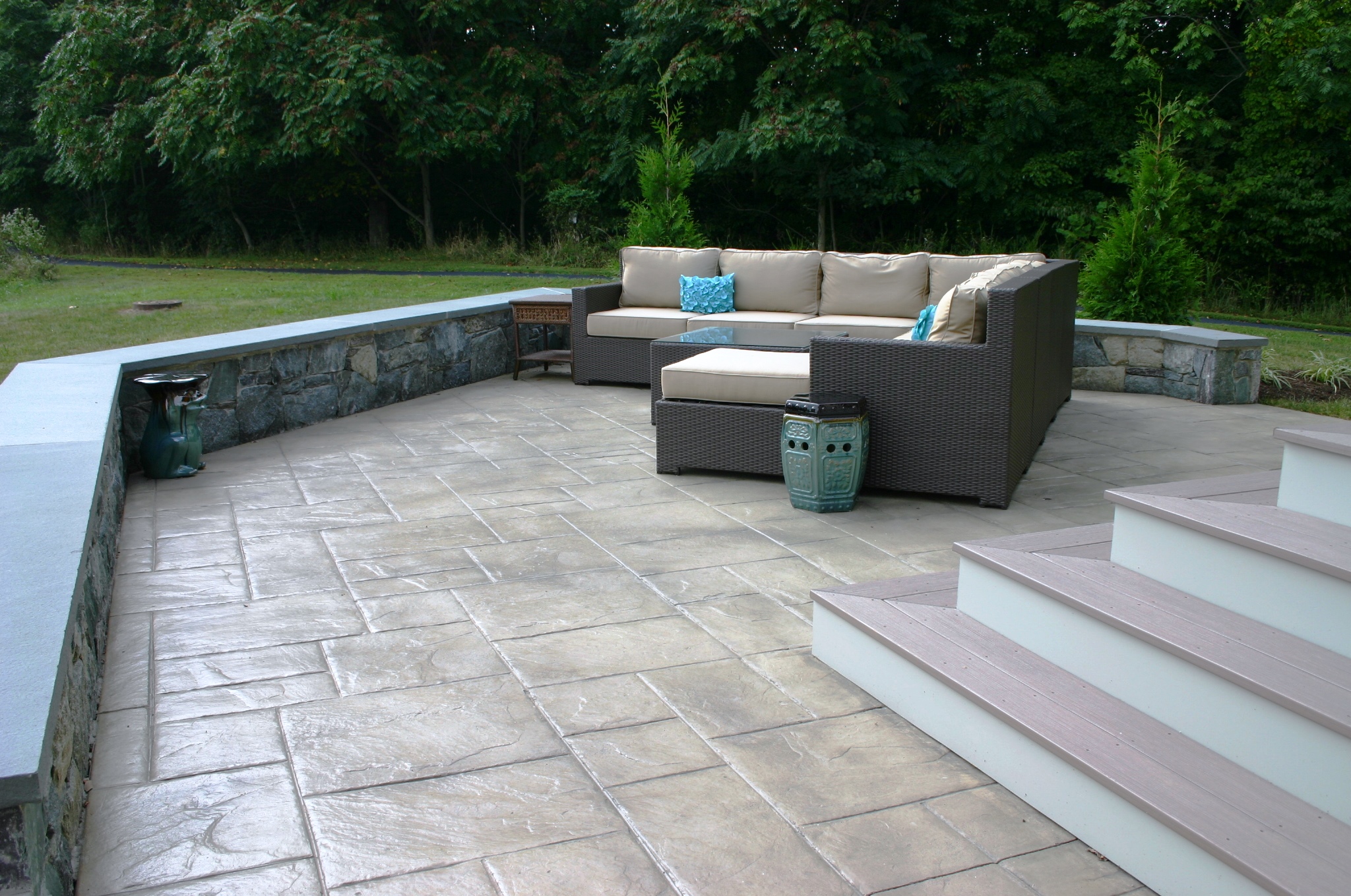 - Concrete- A concrete patio doesn’t have to be boring. A stone or brick border can be added for more interest, and other creative options include exposed aggregate, colored concrete, and patterned concrete.
